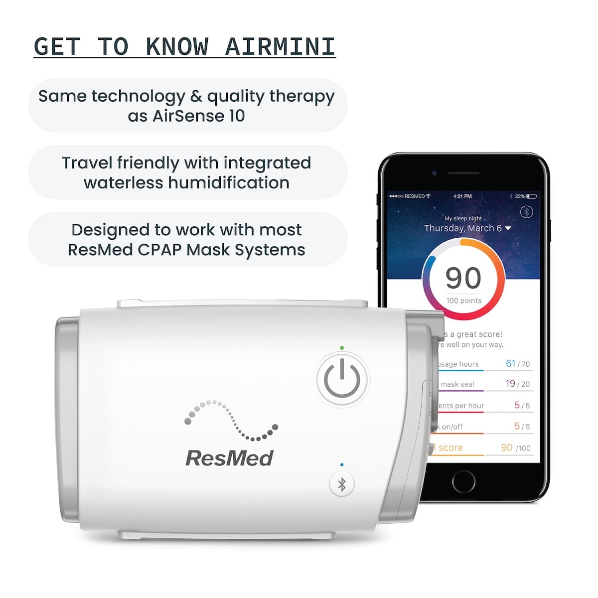 Request This ProductThe ResMed AirMini™ AutoSet is one of the smallest portable CPAP machines on the market, designed to deliver full-featured CPAP therapy whether you’re at home or on the go. With three therapy modes (CPAP, AutoSet™, and AutoSet for Her), ActiveAir™ technology for quiet comfort, and optional waterless humidification, it makes sleep therapy simple, convenient, and effective. Control settings and monitor progress easily through the AirMini app, and enjoy compatibility with a wide range of ResMed masks.