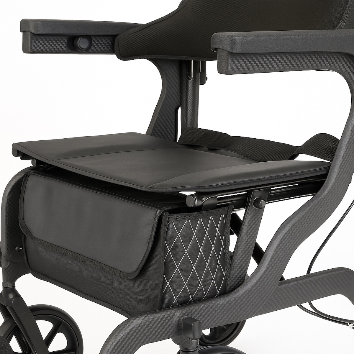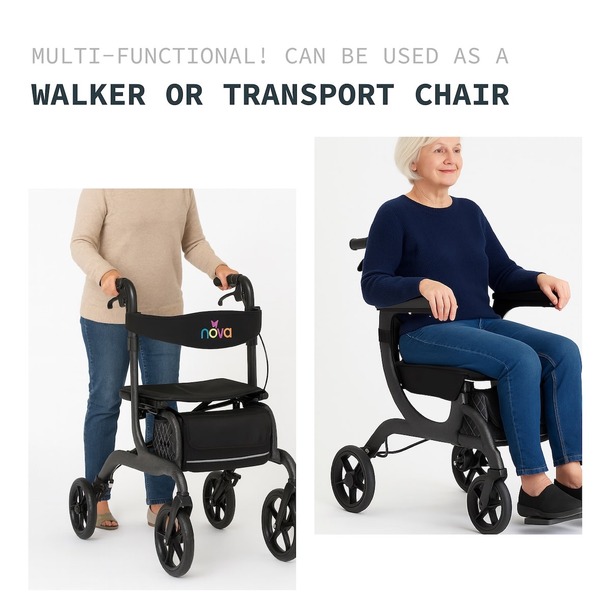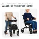 It quickly converts from a rollator walker into a transport chair, giving you both walking support and riding comfort in one device.