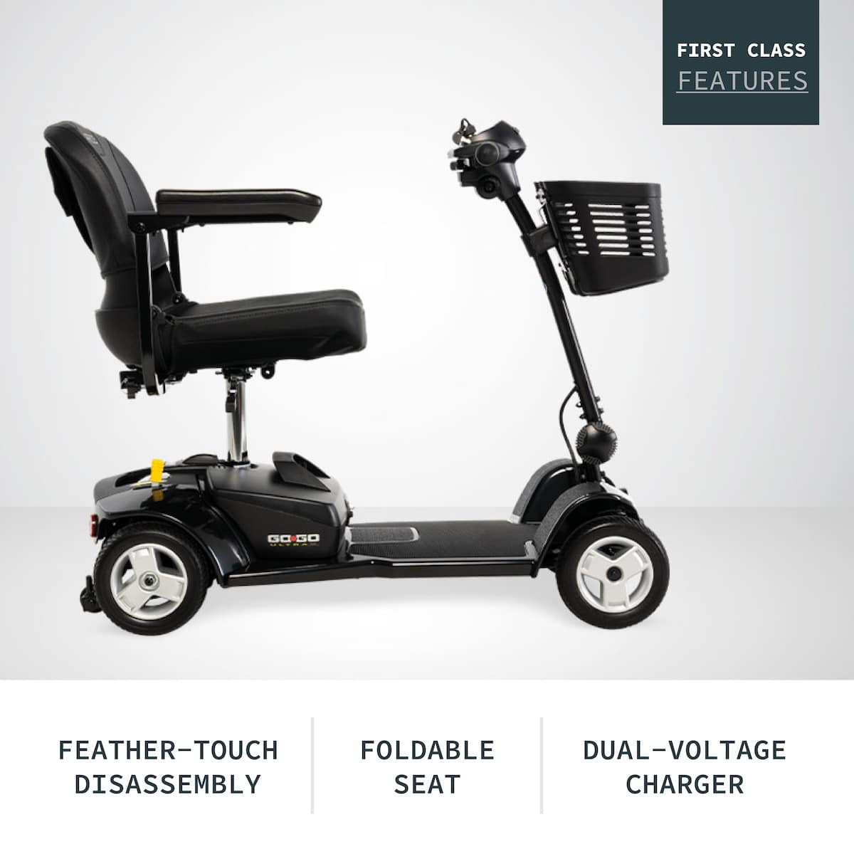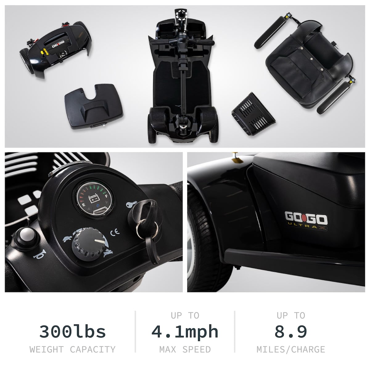 Request This ProductThe Go Go® Ultra X 4-Wheel Scooter combines value, convenience, and performance in one affordable package. With feather-touch disassembly, a compact foldable seat, and a simple drop-in battery box, it’s designed for easy transport and worry-free travel. This economy-class scooter doesn’t compromise on quality, offering speeds up to 4.1 mph, a driving range of up to 8.9 miles, and a 300 lb. weight capacity. Backed by Pride Mobility’s trusted design and reliability, the Ultra X 4-Wheel is perfect for everyday outings, errands, and leisure rides with comfort and stability.