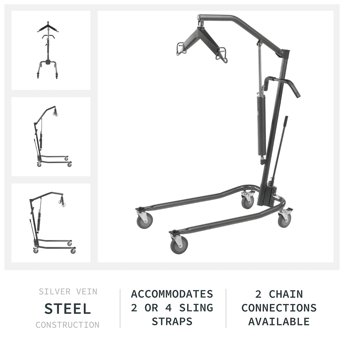 Request This ProductThe Manual Hydraulic Patient Lift provides a safe and reliable solution for patient transfers. Featuring a 6-point cradle, a 400 lb weight capacity, and a durable hydraulic system, this lift ensures smooth, secure lifting—including from the floor. The base easily opens with a hand lever for stability during transfers, while the included full-body sling adds comfort and support. Designed for convenience, the lift assembles quickly without tools using D-ring pins.