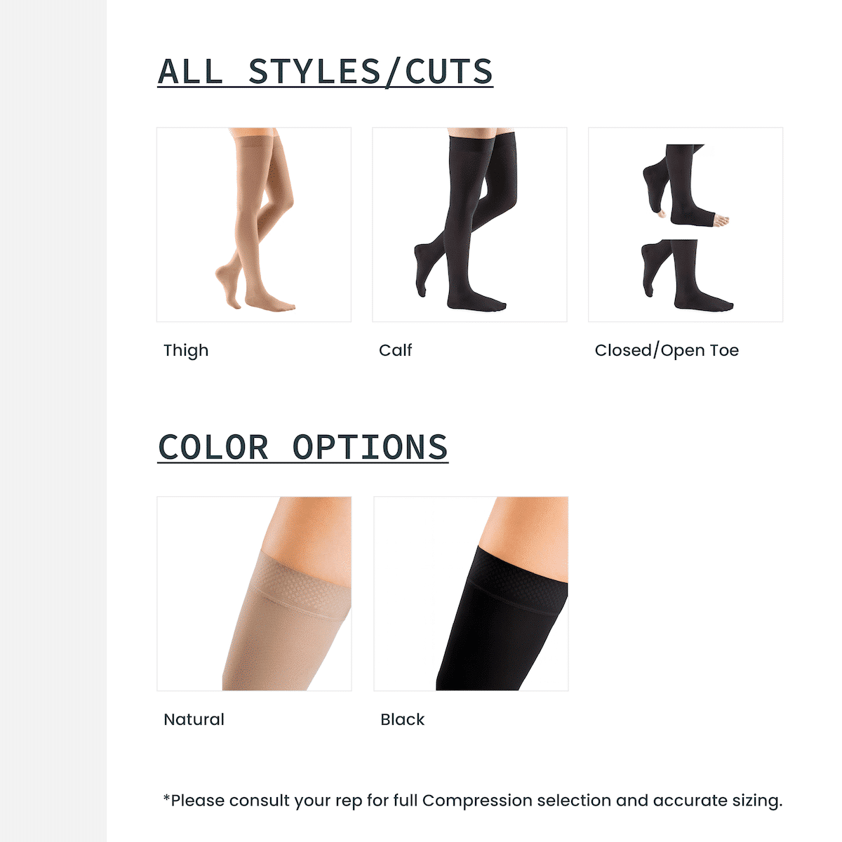 - Clinically accurate graduated compression for effective circulation support - ClimaFresh technology inhibits bacteria growth and neutralizes odors - ClimaComfort fabric regulates temperature and wicks away moisture - Soft, semi-transparent knit conceals blemishes and promotes breathability - Reinforced heel and toe for added durability and longevity - Available in both open and closed toe designs - Wide range of compression levels and sizes for a personalized fit - Variety of fashionable colors suitable for everyday wearIndications