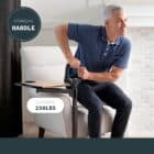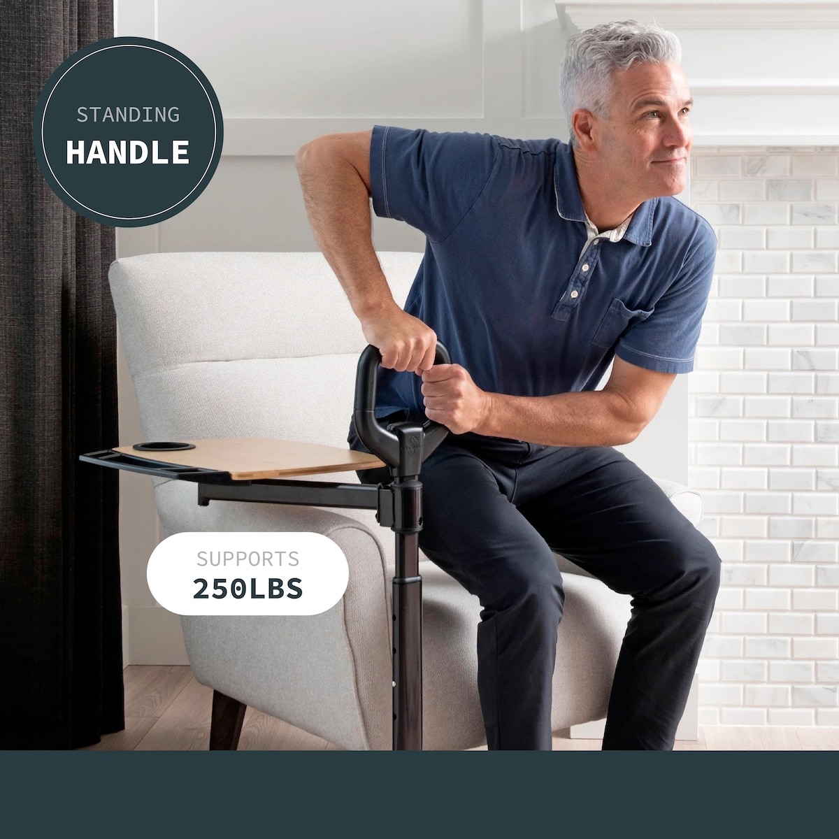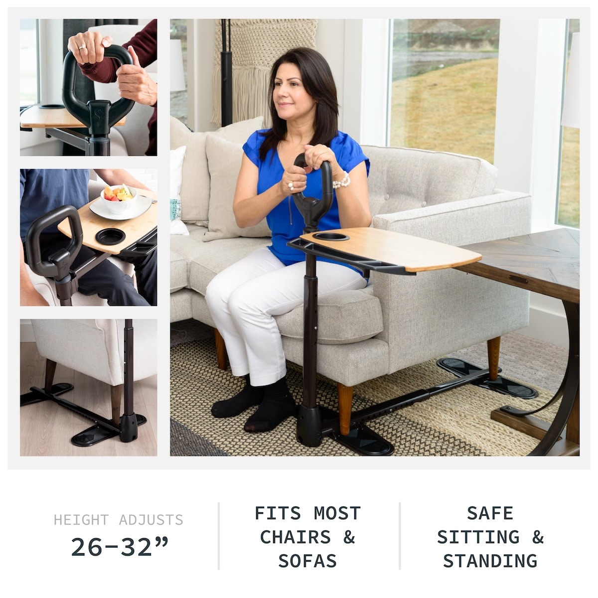 The handle adjusts from 34”–40” and supports up to 250 lbs, making it a secure aid for safely sitting or standing from your favorite chair.