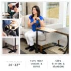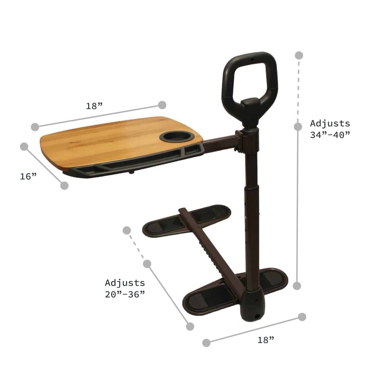 Sturdy grip adjusts 34”–40” to assist with sitting and standing.360° Swivel Tray